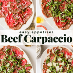 This beef carpaccio recipe is a classic no-cook Italian appetizer that’s surprisingly easy to make at home. Delicate slices of raw beef are finished with capers, pickled shallots, arugula, olive oil, and shaved Parmesan for a fresh, elegant starter.