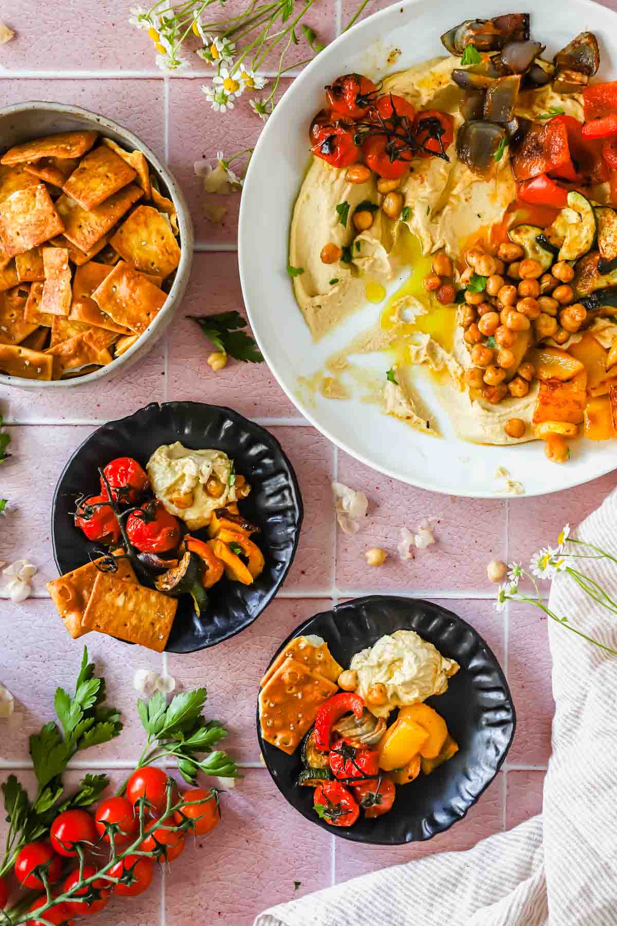 - To assemble, spread the hummus into a large serving bowl or plate, or use it as a base with additional grains such as quinoa or rice. Top with the roasted vegetables and garbanzo beans.