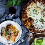 If you are using a large deep pan like mine or a dutch oven like this, you can use the same pan to cook your pasta and pasta-meat sauce mixture and then use the same pan to bake the lasagna in so you're only using one pan for this recipe.