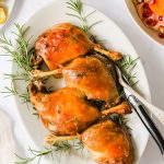 If you’d like to crisp the skin and enjoy it after the duck is cooked, I recommend pan-searing the duck leg quarters in a skillet, skin side down until the skin has become golden and very crisp. Or add the legs back to the oven on the top rack and bake skin side up at 450°F until skin is crispy, it takes about 8-12 minutes.