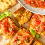 Make Ahead: Make the tomato mixture the day before and add to a airtight container, keep in the refrigerator. Slice the bread and keep in a ziplock, peel the garlic and keep in a container. When ready to make, toast the bread and then you’re all ready to go with everything else.