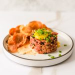 Then add a round mold on top, spoon in the steak tartare inside, then remove the mold. Top with fresh egg yolk, sprinkle with a little additional flaky sea salt, and finely chopped chives. Serve cold with your favorite crostini or crackers.
