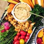 I added raw rainbow carrots, radishes, baby tomatoes, roasted cauliflower with paprika and olive oil, grilled broccolini and asparagus to a large platter and placed the dip in the middle. Also added a bowl of root veggie chips instead of other chips, adds great pop of color and the flavor with the dip is amazing. The veggies are great for this and the dip works very well with them. But you can add whatever veggies and even grilled chicken or another protein to this platter to make it your own flavors. It's super flexible.